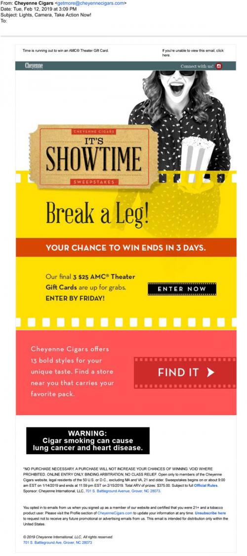 cigars in February 2019 promoting a giveaway of movie ticket gift cards in the Showtime sweepstakes.