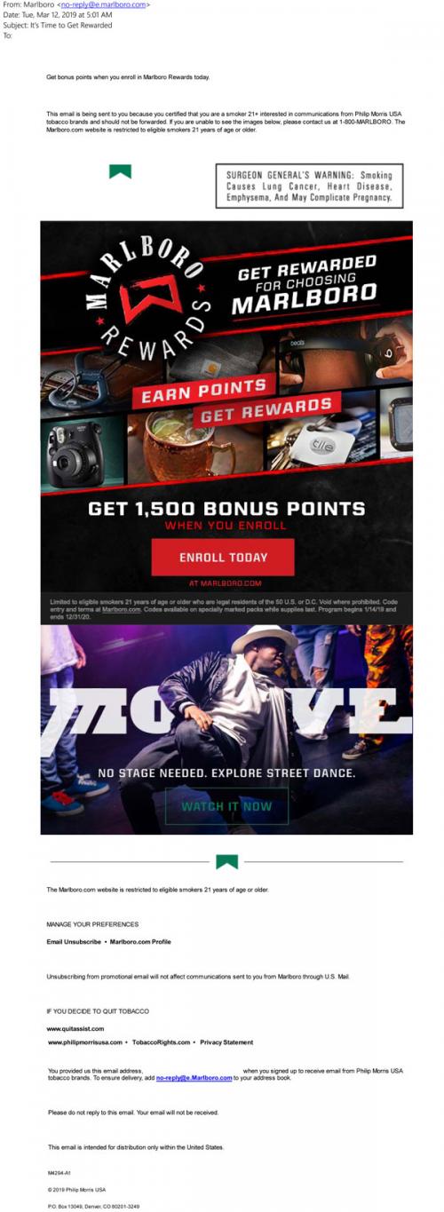 Email from Marlboro Menthol in March 2019 reminding the recipient to enroll in the Rewards program to claim bonus points, and includes a link to watch a featured video on street dance.
