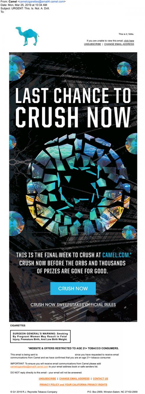 Email from Camel in March 2019 reminding the recipient to enter the Crush Now sweepstakes before the contest ends. Provides a link to enter on the brand website.