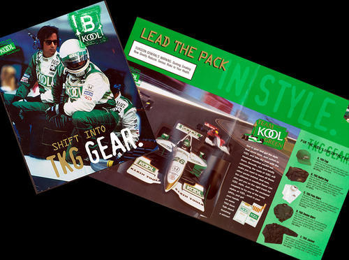 Catalog coupons, 2 men in Racing suits on cover. "Team Kool Green sponsored by Kool Cigarettes" "B Kool." "Shift into TKG Gear." Green and white, direct mail.