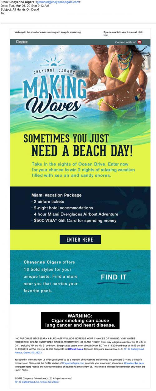 Email from Cheyenne cigars promoting the Making Waves sweepstakes March 2019. Links to the brand website to enter the giveaway and use a store locator.