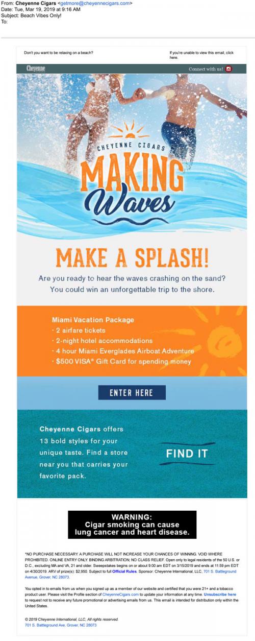 cigars promoting the Making Waves sweepstakes in March 2019. Links to the brand