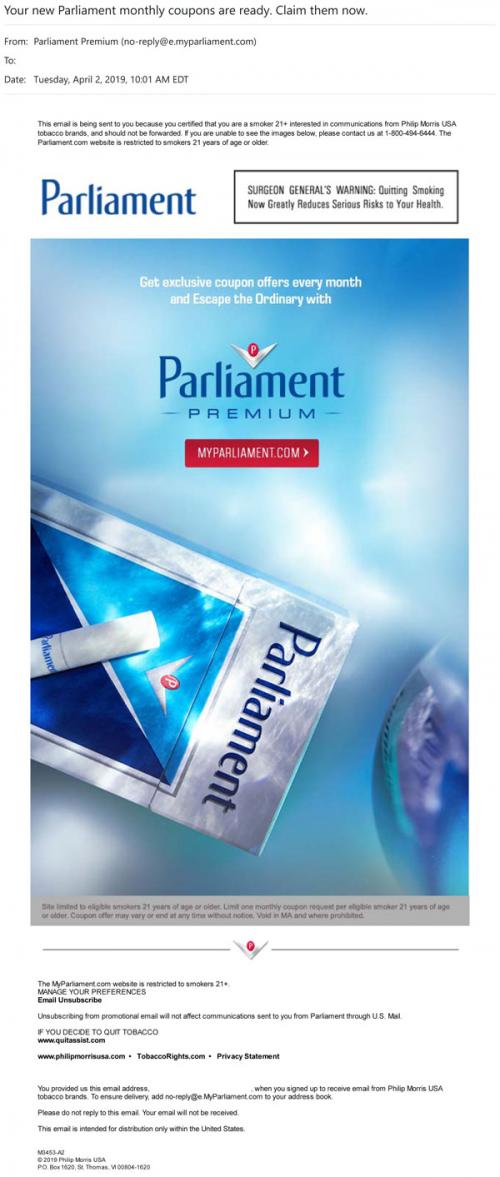Email from Parliament in April 2019 promoting the Premium coupon program that can be signed up for on the brand website.