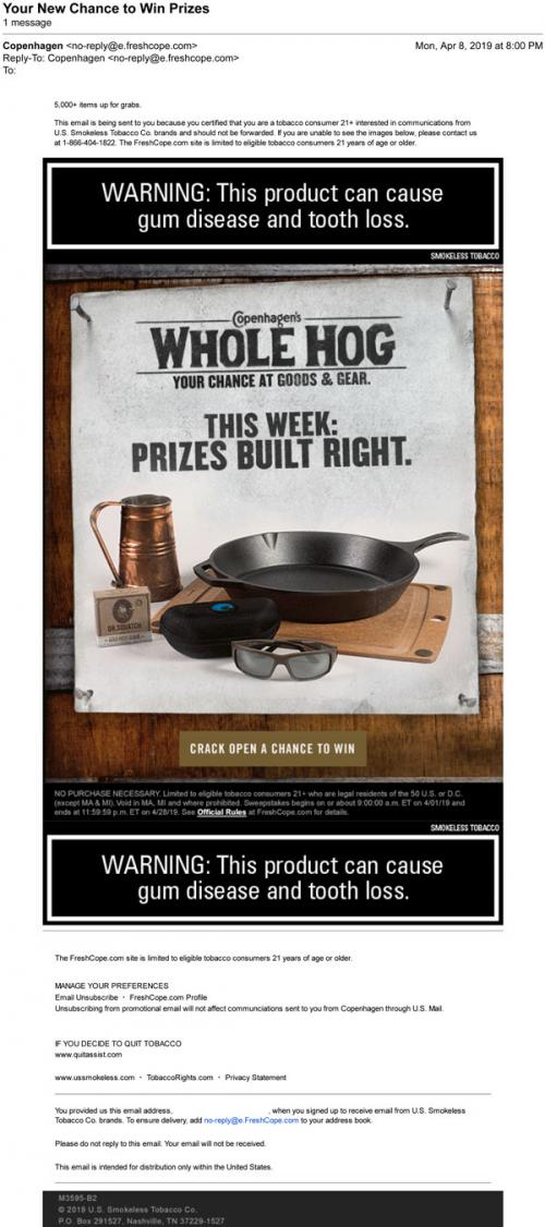 in April 2019 promoting the Whole Hog sweepstakes, showing a selection
