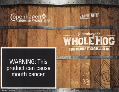 Direct mail from Copenhagen received in April 2019 that promotes the Whole Hog sweepstakes. Includes a coupon and reminds the recipient to enter on the brand website.