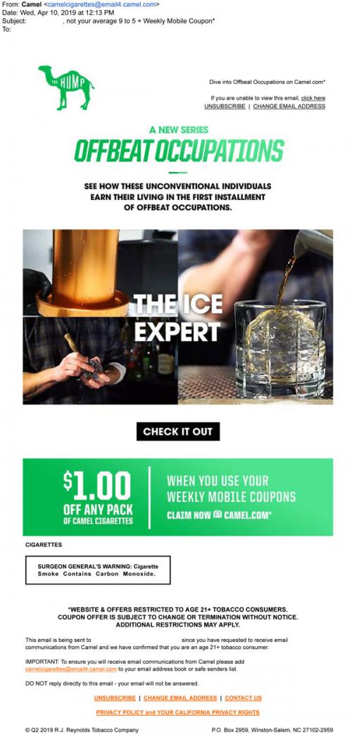 Email from Camel in April 2019 promoting a new series on the Hump called Offbeat Occupations to watch, as well as weekly mobile coupons to claim.
