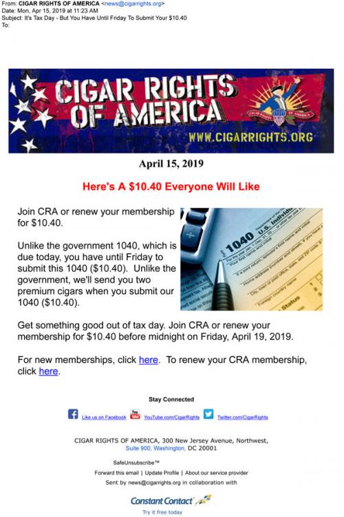 Email from the Cigar Rights of America in April 2019 with an offer to renew a membership or join the organization, sending two cigars in exchange for the fee.