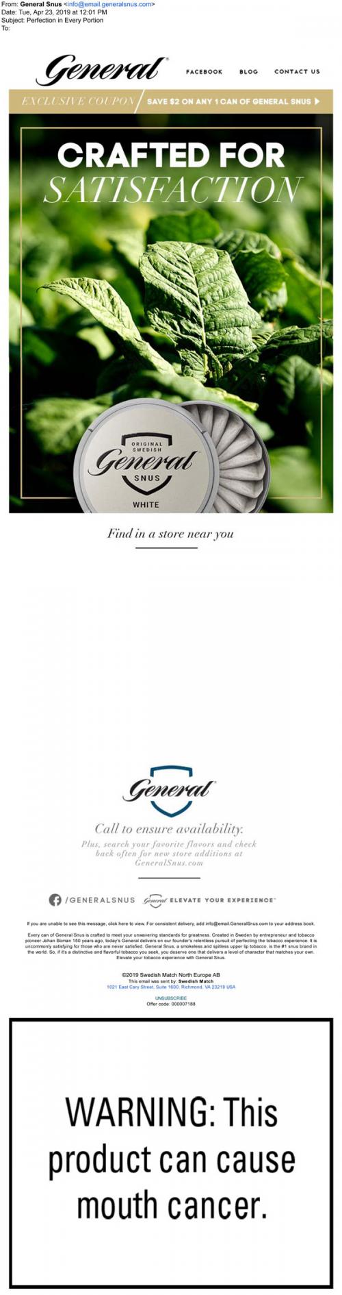 Email from General Snus in April 2019 inviting the recipient to the brand website to claim a coupon, and listing some retail locations to purchase their products at.