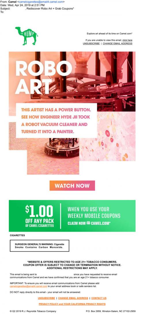 Email from Camel in April 2019 promoting a new featured artist on The Hump, with a link included to claim weekly mobile coupons.