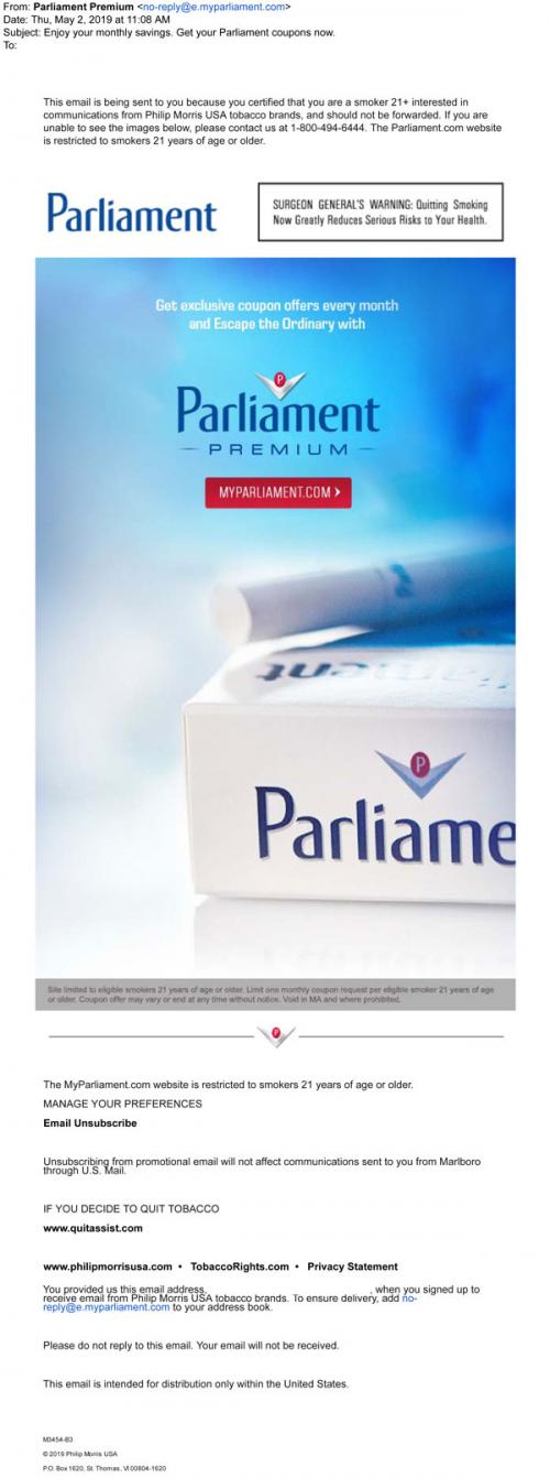Email from Parliament in May 2019 with a link to the brand website to claim coupons.