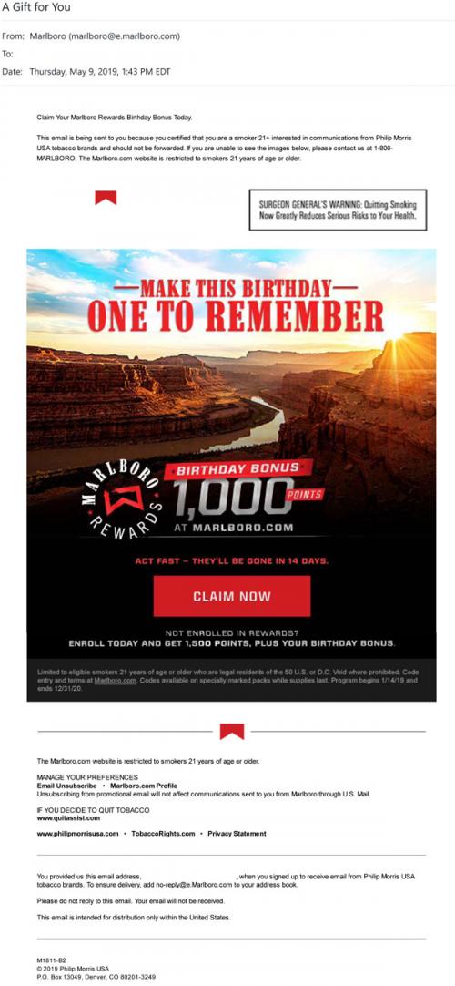 Email from Marlboro in May 2019 with extra Rewards points as a birthday gift for the recipient, with a link to the brand website to claim them.
