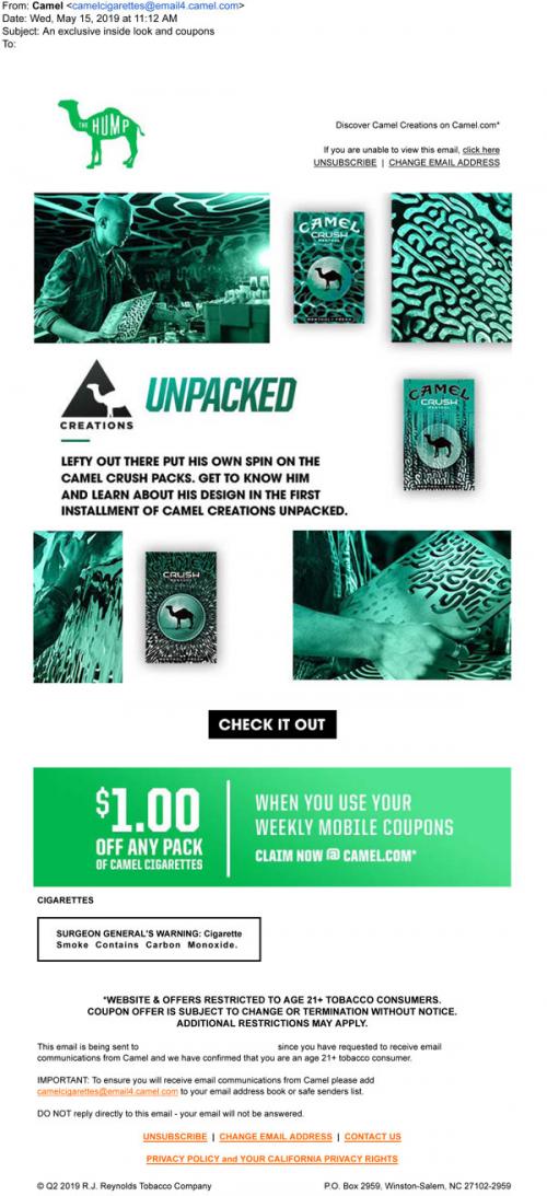 Email from Camel in May 2019 featuring an artist who designed Camel Crush packs on Camel Creations. Links to the brand website to learn more and to claim weekly mobile coupons.