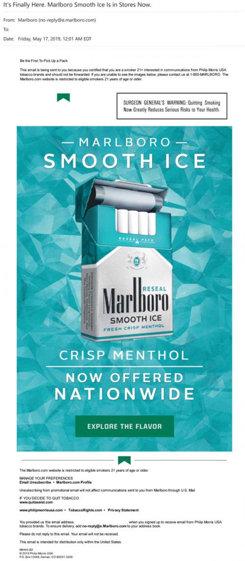 Marlboro Menthol email in May 2019 promoting the Smooth Ice products that are now available nationwide in the reseal packs.