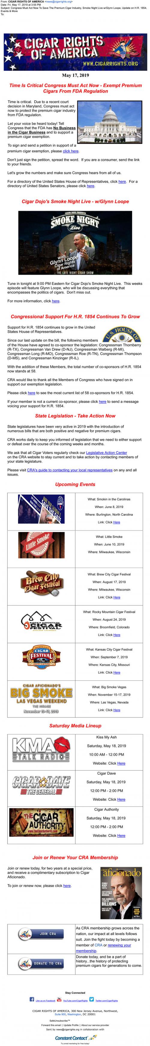 Email from the Cigar Rights of America in May 2019 announcing news about current cigar legislation, upcoming events and related media, and soliciting for memberships and donations.