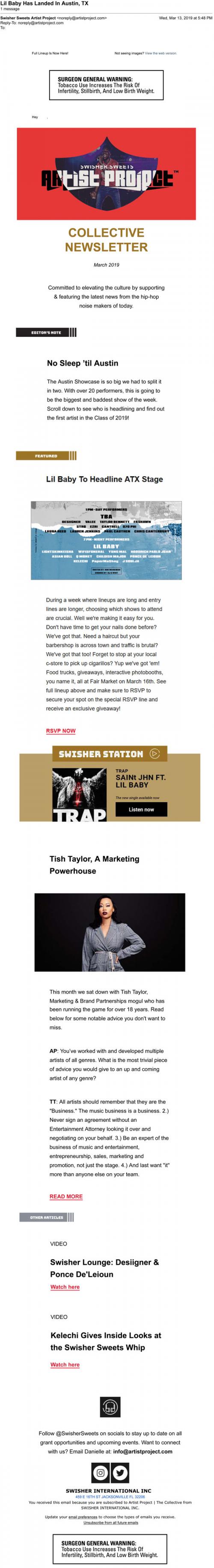 Email from the Swisher Sweets Artist Project in March 2019 with a link to RSVP for a music party sponsored by the brand in Austin, TX. Also includes an interview with a music marketing pro and links to videos to watch on the brand website.
