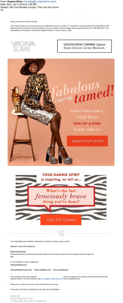 Email from Virginia Slims in June 2019 with a link to claim monthly coupons on the brand website. Also invites the recipient to share about brave things they've done in a conversation online as well.