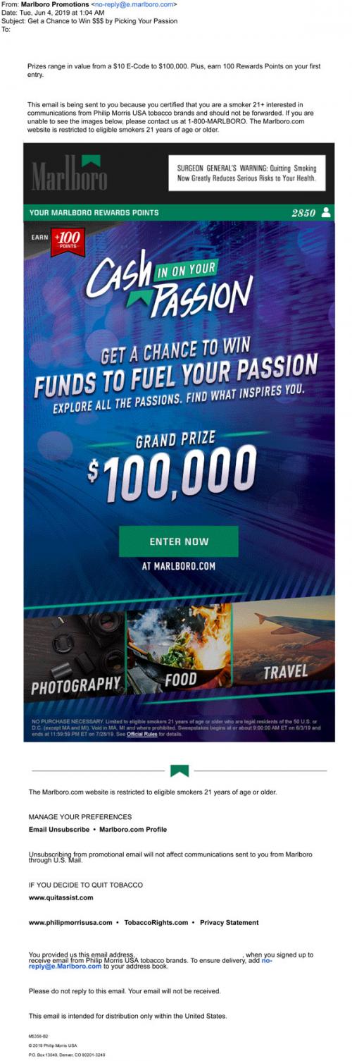Email from Marlboro Menthol in June 2019 promoting the Cash In On Your Passion sweepstakes, with a link to the brand website to enter. Includes the incentive of Rewards points for entering.