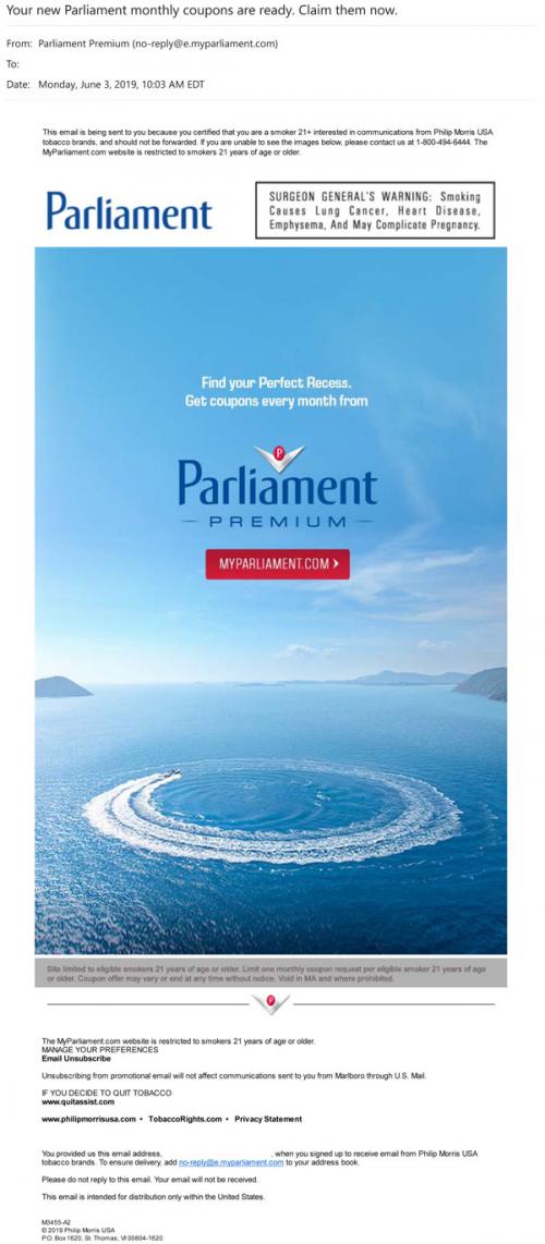 Email from Parliament in June 2019 promoting the Parliament Premium monthly coupon program, with a link to the brand website to sign up.