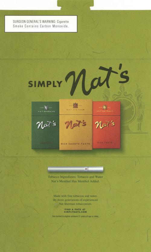 Direct mail from Nat Sherman's promoting their Nat's cigarettes, listing the ingredients as "tobacco and water." Invites the recipient to the brand website to find a retailer and claim mobile coupons. Includes a coupon to get a pack for 2$.