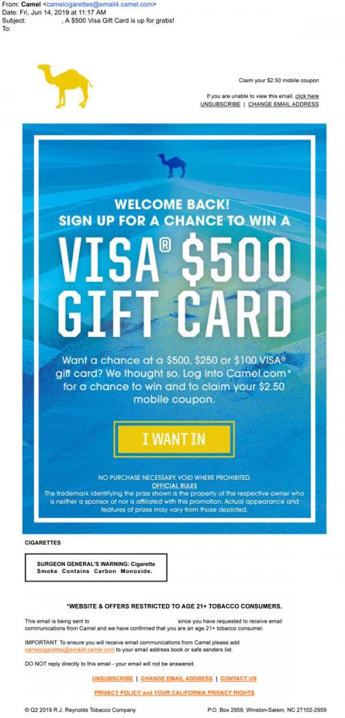 Camel email in June 2019 promoting a chance to win a gift card by visiting the brand website. Includes a reminder to claim mobile coupons.