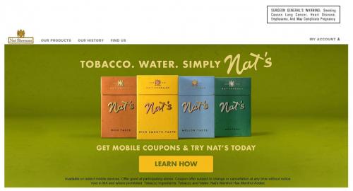 Banner images from the Nat Sherman brand website that promotes their Nat's rebranded varieties, advertised as being made with only tobacco and water and containing 25% more tobacco, with a reminder to claim mobile coupons.