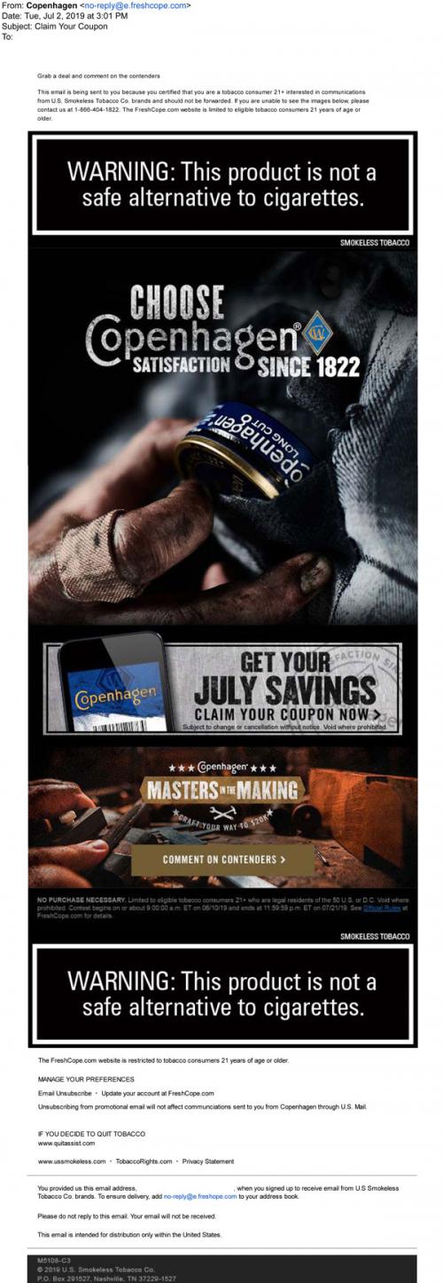 Coupon - Discount E-mail Smokeless Tobacco Sweepstakes