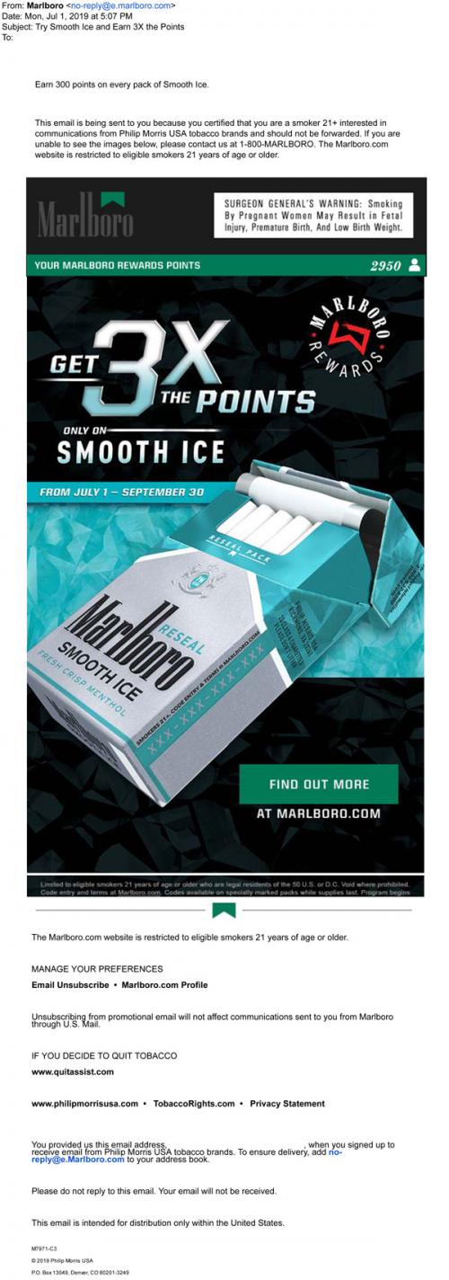 Email from Marlboro in July 2019 promoting extra Rewards points available on packs of Smooth Ice, for a limited time.