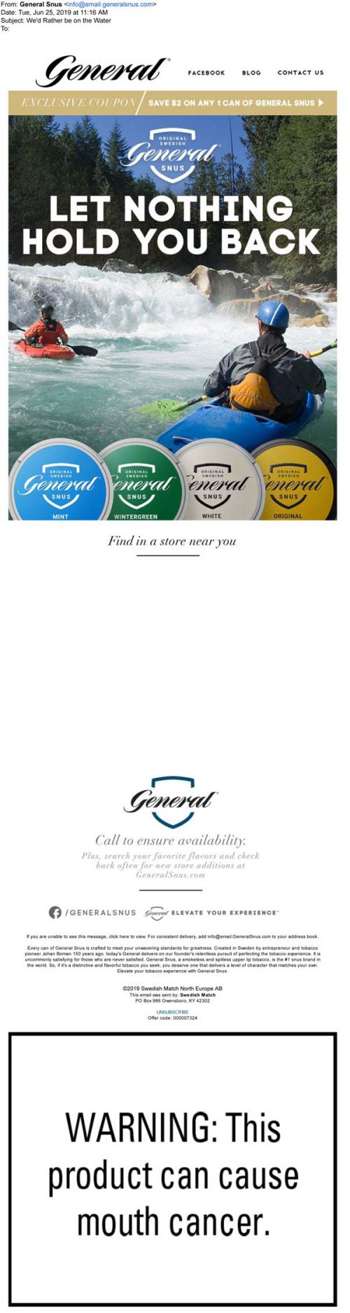 Email from General Snus in June 2019 providing a link to the brand website to claim a coupon and listing some nearby retail locations.