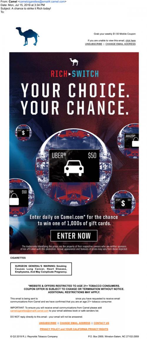 Email from Camel in July 2019 promoting the Rich Switch sweepstakes, with a reminder to enter daily on the brand website