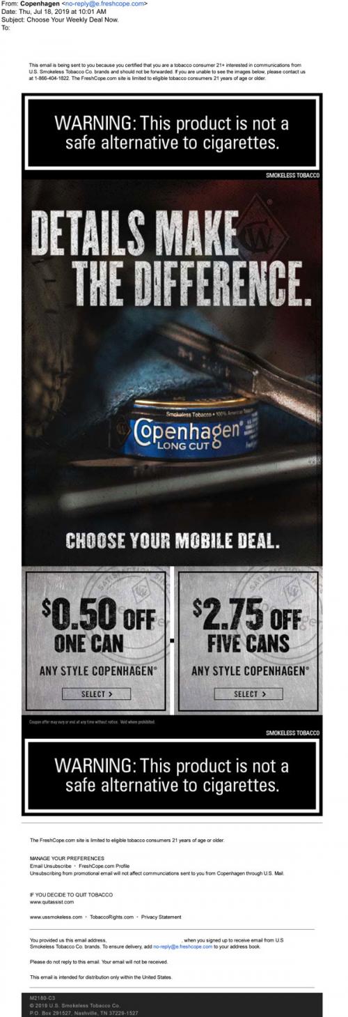 Email from Copenhagen in July 2019 promoting mobile coupons and their mint long cut product.