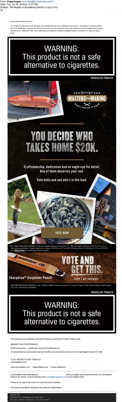 E-mail Promotions-Promo items/Gifts Smokeless Tobacco Sweepstakes
