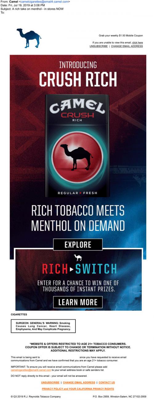 Email from Camel in July 2019 reminding the recipient that they can now buy Crush Rich packs in stores now. Links to the brand website to learn more and to enter the Rich Switch sweepstakes.