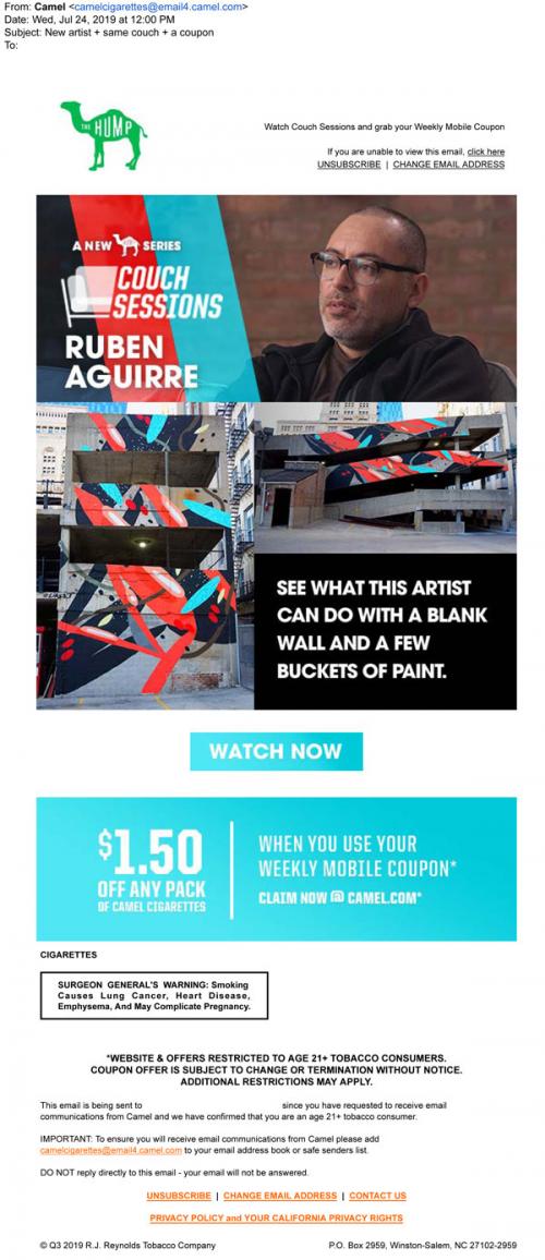 Email from Camel in July 2019 promoting a new series to watch on the Hump called Couch Sessions, featuring a street artist. Also links to claim a weekly mobile coupon