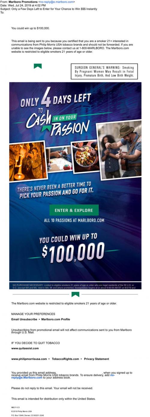 Email from Marlboro in July 2019 promoting the final days of the Cash In On Your Passion sweepstakes, with a link to the brand website to enter.