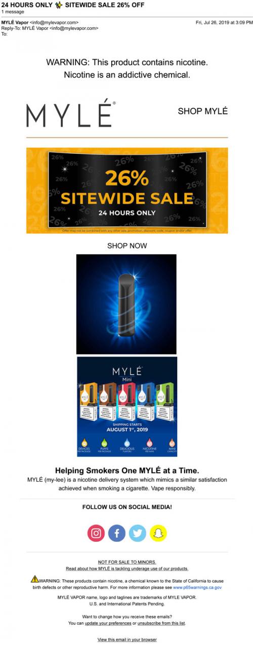 Email from MYLE in July 2019 announcing a 24 hour sale through the brand website, and the new Mini disposable device that will be available in August.