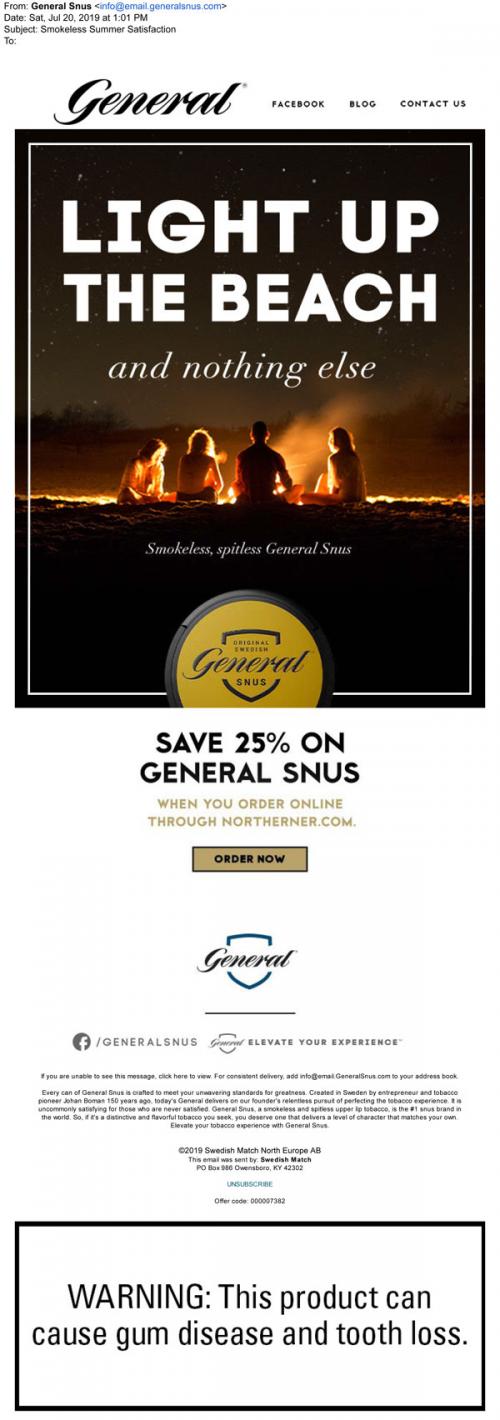 General Snus email in July 2019 promising summer satisfaction and a discount when purchasing their products through northerner.com. Invites the recipient to "light up the beach, and nothing else."