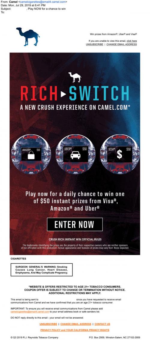 Email from Camel in July 2019 promoting the Rich Switch sweepstakes, with a link to the brand website to enter.