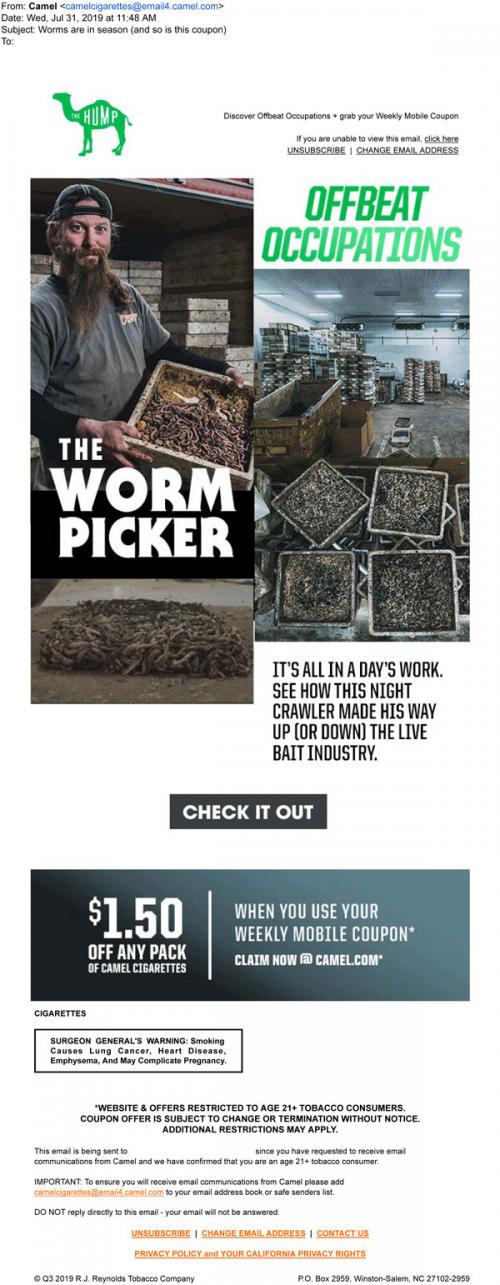 Email from Camel in July 2019 with a new Offbeat Occupations feature on The Hump to check out, as well as a link to claim weekly mobile coupons.