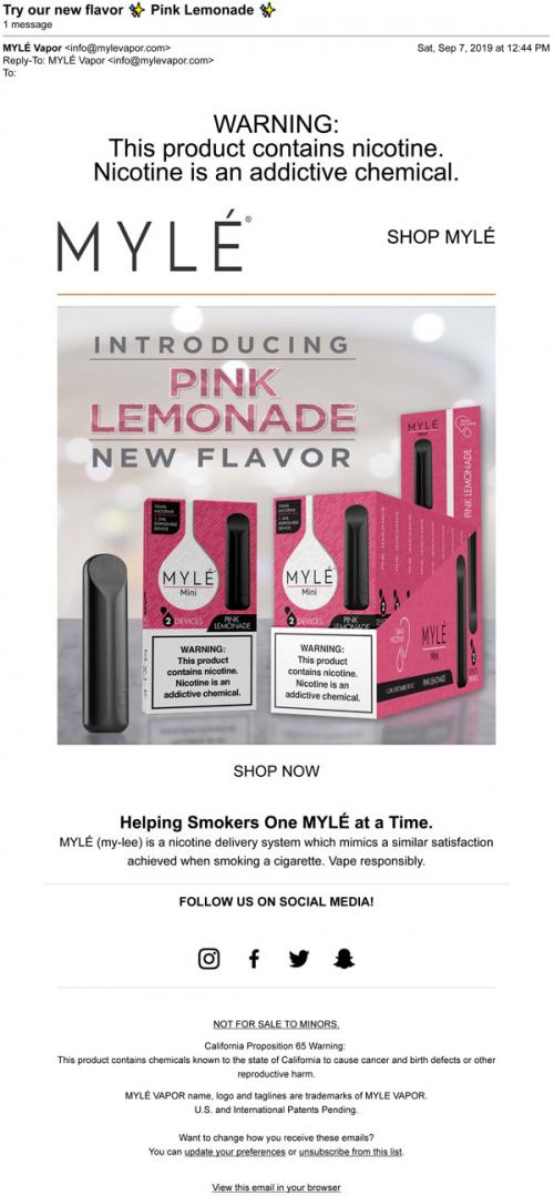 Email from MYLE in September 2019 promoting the new Pink Lemonade flavor available in their disposable device pod product.