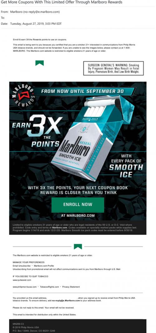 Marlboro email in August 2019 promoting the opportunity to get 3x the Rewards points on purchases of Smooth Ice packs throughout September. Invites the recipient to enroll in the brand's Rewards program.