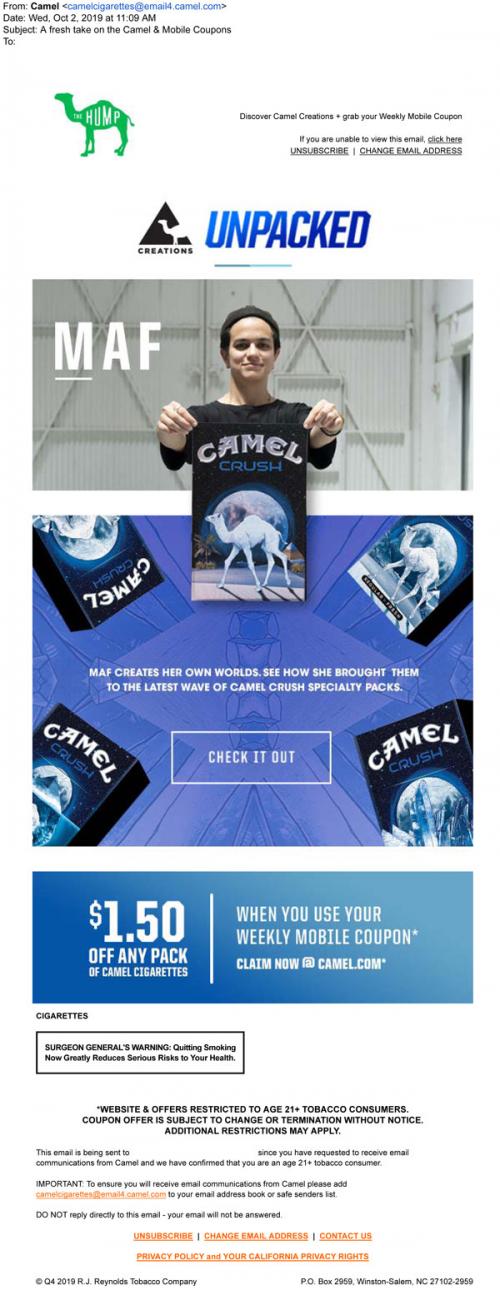 Email from Camel in October 2019 promoting a new feature on the Hump, Creations Unpacked, which features an artist from their new Camel Crush pack designs. Also provides a link to claim mobile coupons from the brand website.
