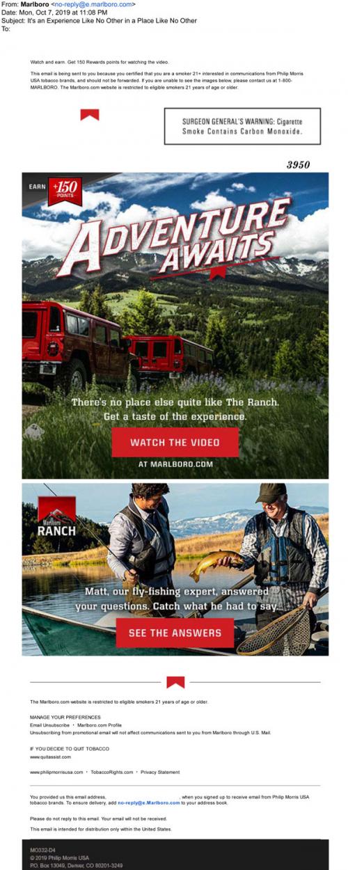 Email from Marlboro in October 2019 promoting a featured video about the Ranch, as well as expert answers about fly-fishing.