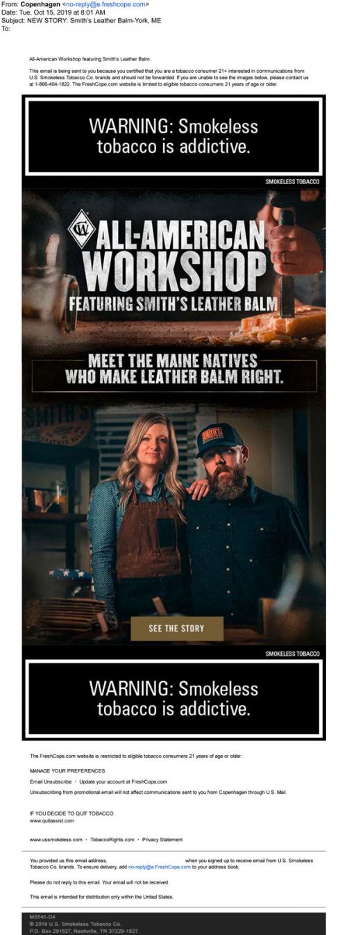 Email from Copenhagen in October 2019 with a new feature on All-American Workshop, highlighting local craftsmen.