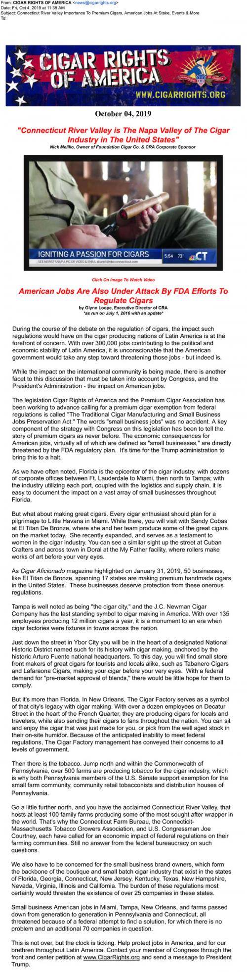 Email from the Cigar Rights of America in October 2019 that includes an article about cigar regulation and American jobs, as well as reminders to contact the president and representatives in office or sign petitions. Promotes cigar events and media, and solicits for donations and memberships.