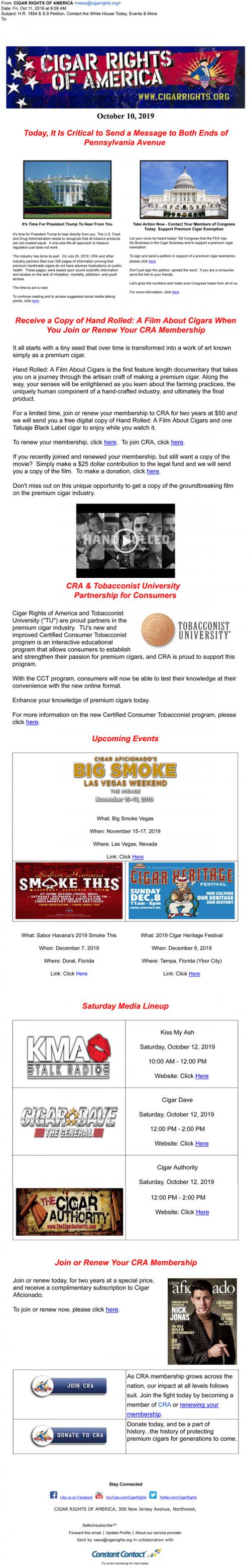 Email from Cigar Rights of America in October 2019 that reminds the recipient to contact the president and representatives to support positive cigar legislation. Includes an offer of a cigar film for membership renewal and promotes the Tobacconist University program. Lists cigar events and media and solicits for donations and memberships.