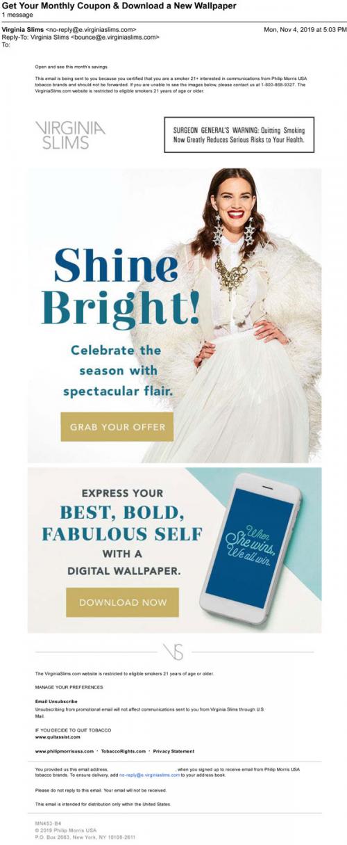 Email from Virginia Slims in November 2019 providing links to claim coupons and download digital wallpapers for your phone from the brand website.