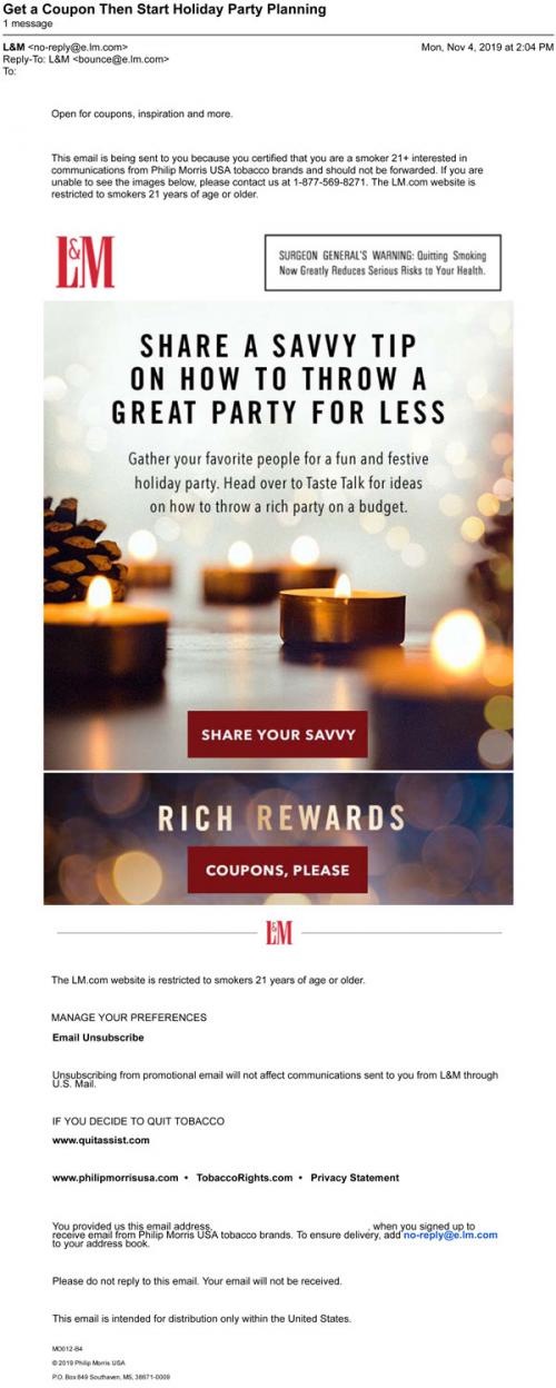 Email from L&M in November 2019 with links to claim coupons and get ideas about how to throw a holiday party on a budget.