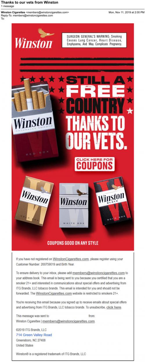 Email from Winston in November 2019 thanking veterans for Veterans' Day. Includes a link to claim coupons from the brand website.