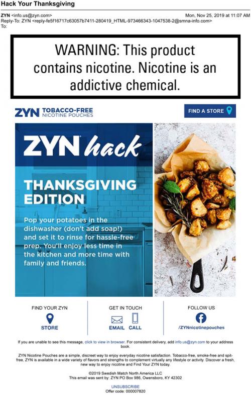 Email from ZYN in November 2019 with a "Thanksgiving hack" and links to use a store locator or follow the brand on social media.
