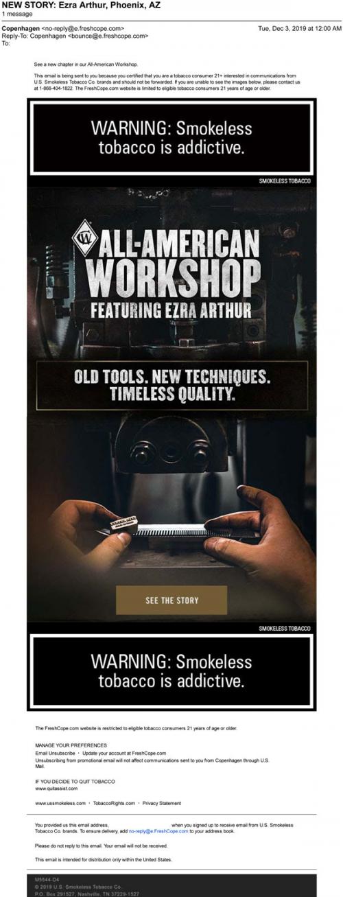 Email from Copenhagen in December 2019 promoting a new featured craftsman on the All-American Workshop, with a link to the brand website to learn more.